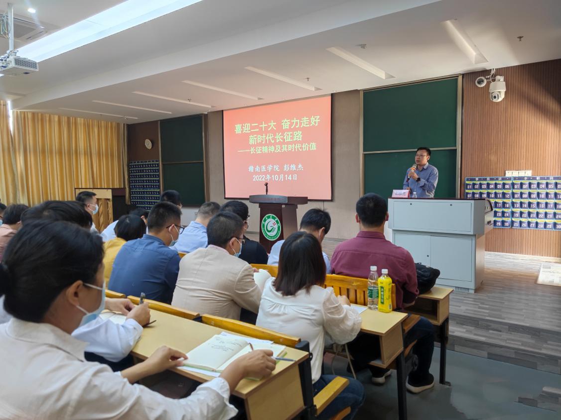 10月14日,学校党委委员、副校长彭维杰到药学院讲授了一堂题为《喜迎二十大 奋力走好新时代长征路--长征精神及其时代价值》的专题党课,该院领导班子、师生代表共计240人参加。