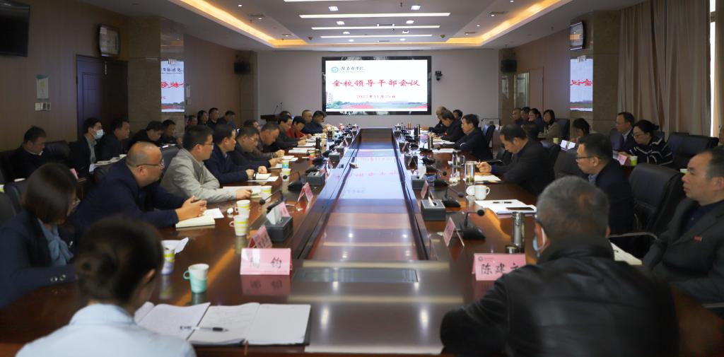 11月25日上午,我校在黄金校区召开全校领导干部会议,传达学习中央有关重要文件精神和中共江西省委第十五届三次全体(扩大)会议精神。学校党委书记李恭进主持会议并讲话,在家的学校党委领导班子成员曾泽鑫、陈亮、黄瑞忠、肖树辉、彭维杰、廖志平、赖传景出席会议。
