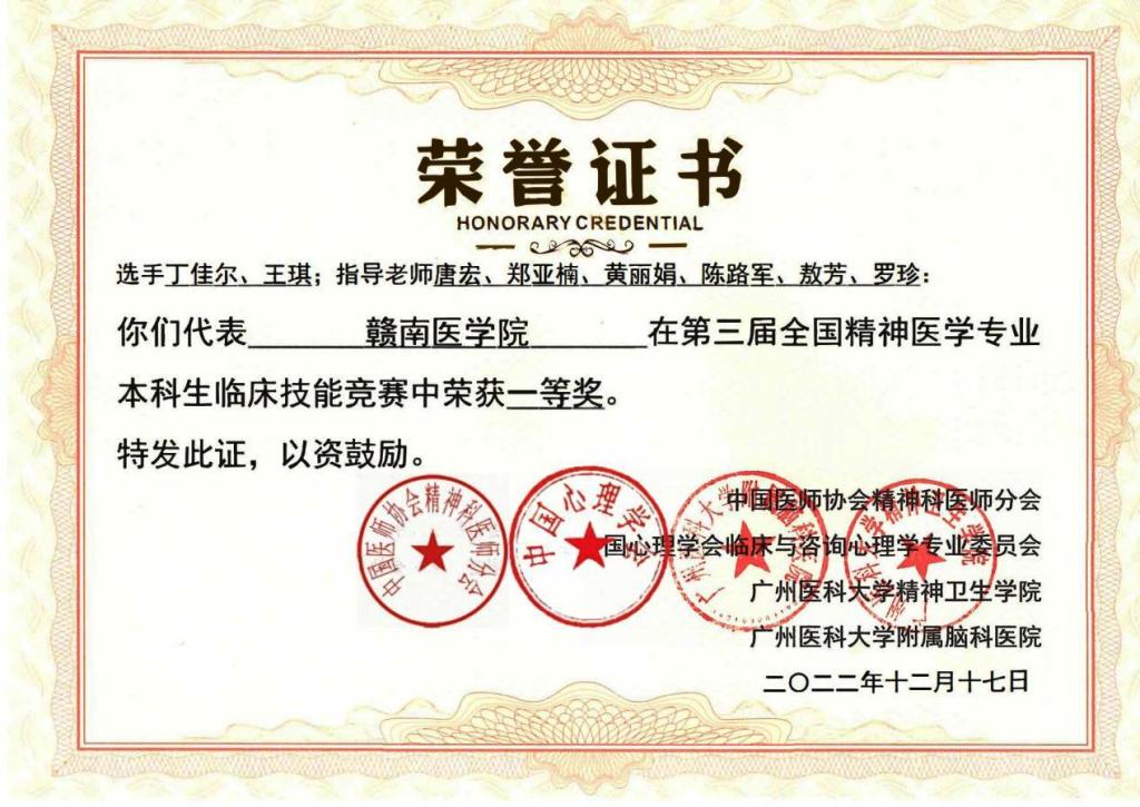 据悉,全国精神医学专业本科生临床技能大赛是由中国医师协会精神科医师协会(CPA)和CPA精神医学教学专业指导委员会主办的全国唯一精神医学专业技能竞赛。第三届全国大赛吸引了来自广州医科大学、中国医科大学等知名院校的20多支队伍参加,本次大赛采用线上方式进行,在参赛过程中我校选手问诊流畅、执行规范,展示了精神医学专业大学生良好的精神风貌与专业素养。经过激烈角逐,我校2019级精神医学学生丁佳尔、王琪荣获一等奖。