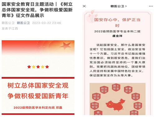 举行一场主题演讲比赛。4月15日当天,举行了一场富有激情的演讲赛,重在借助师生同台演讲为契机,结合国家安全教育主题,大力宣传贯彻总体安全教育观。学生以总体国家安全观为主线,契合政治安全、国土安全、文化安全、社会安全、科技安全等多个领域,结合亲身经历和所悟所感,用生动的语言与鲜活的案例,阐述了国家安全、人人有责的核心价值理念。一个个国家安全故事、案例展现了同学们国安存心中,保护正当时的责任感,也体现了同学们树牢国安意识,护国家安全的实际行动。