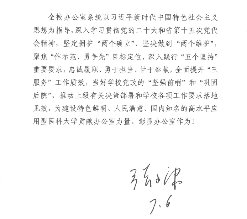 叶军明要求,学校办公室系统工作人员要始终保持踔厉奋发、笃行不怠的精神状态和只争朝夕、一往无前的奋进姿态,抓紧每一天,干好每件事,努力把办公室系统工作做得更好,服务好学校“高质量发展三年行动”,努力实现“三个目标”、推进“八大建设”,在推动学校事业发展中彰显办公室担当、展现办公室作为、贡献办公室力量!