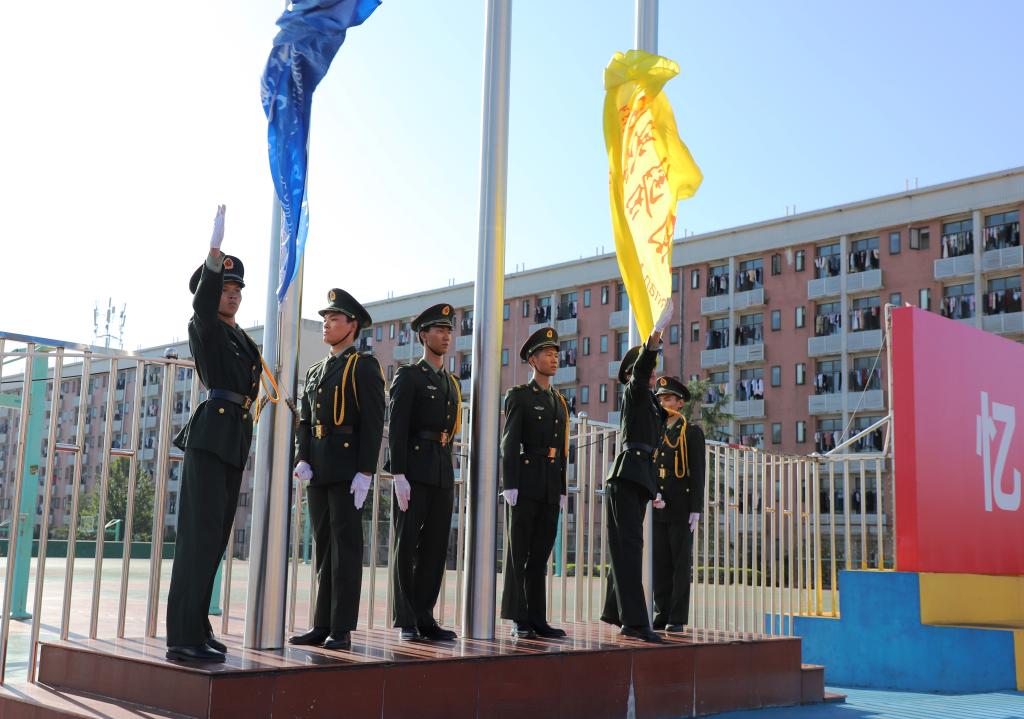 典礼伊始,全场起立,升国旗,齐唱国歌,向国旗敬礼。