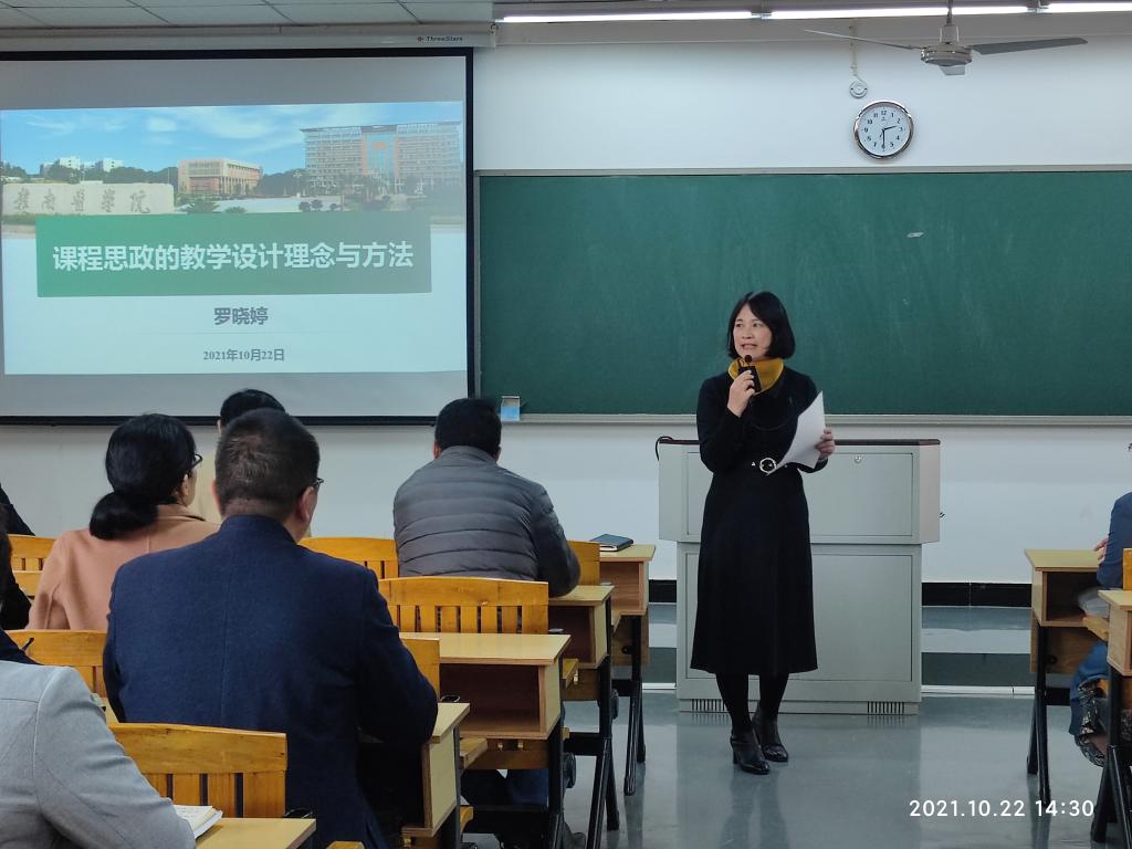 10月22日,“蓉江论坛”药学院分论坛开讲。论坛邀请了我校国家级“课程思政示范课程”—《生物化学与分子生物学》课程负责人、基础医学院副院长罗晓婷,作题为“课程思政的教学设计理念与方法”专题讲座。药学院院长范小娜主持,学院全体教师聆听讲座。