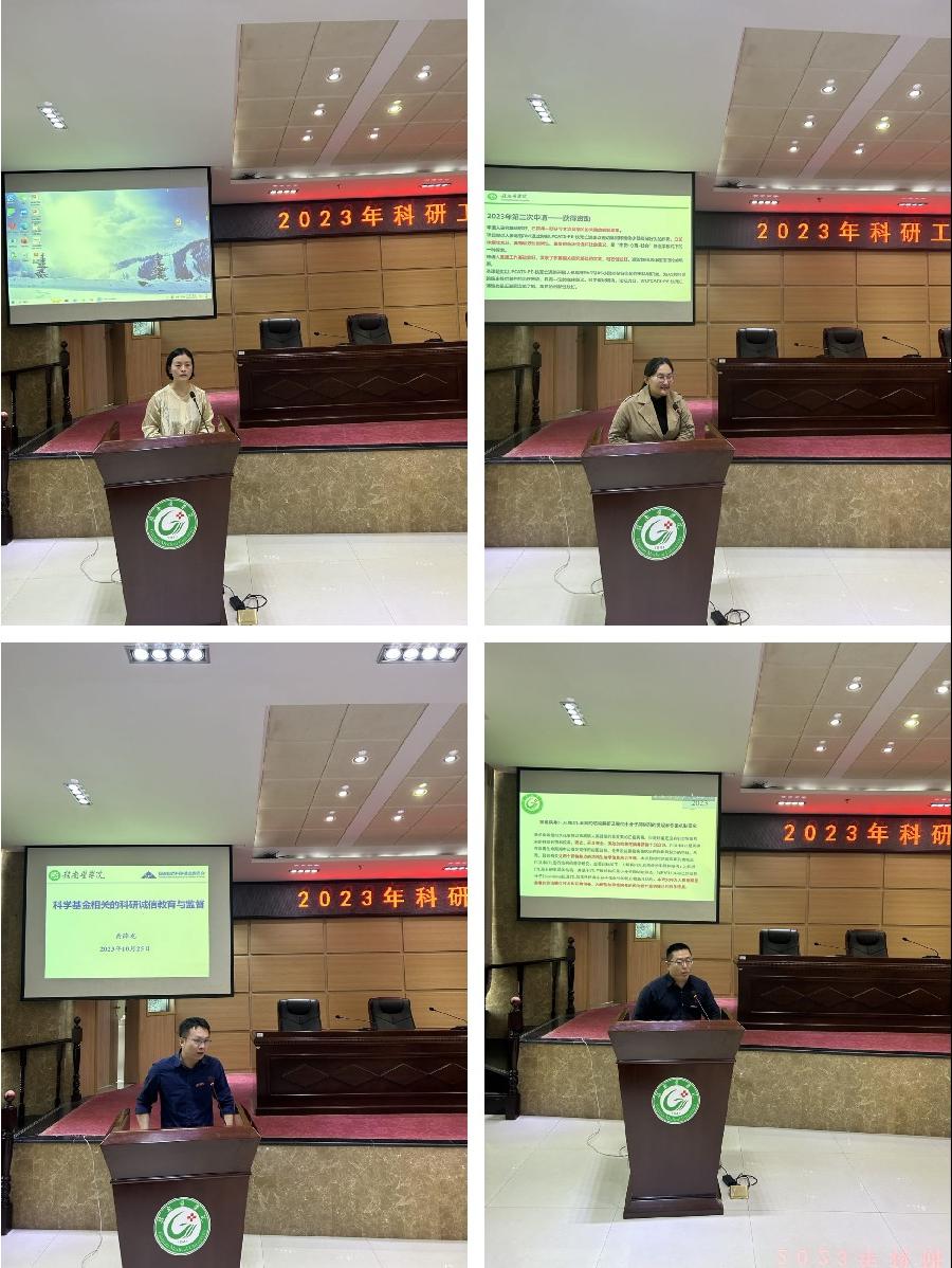 学校科研处对2023年度国家基金申报工作与国家基金中标情况以及2022年科研团队资助情况做了系统梳理与全面总结,对2024年度国家基金项目申报进度安排做了详细介绍。优秀博士分享了国家自然科学基金项目的申报经验、科研团队建设经验与科研诚信建设工作。
