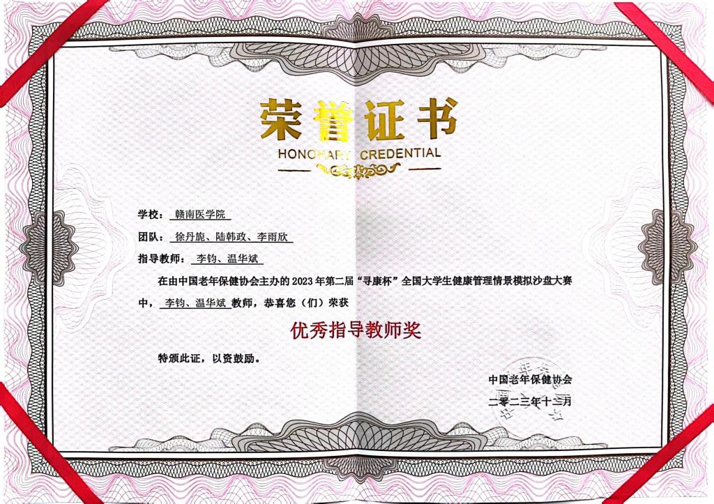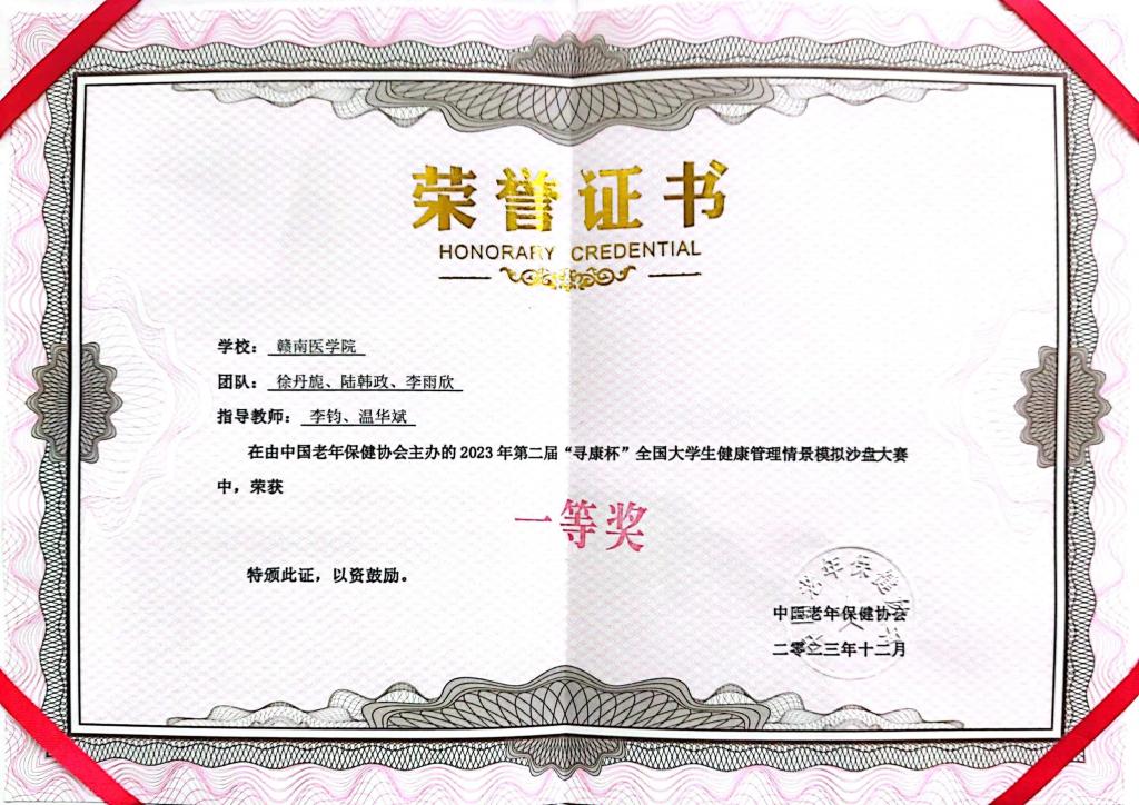 经过健康管理方案设计和健康管理决策沙盘模拟等环节的激烈角逐,由我校公共卫生与健康管理学院李钧、温华斌两位教师指导的健康服务与管理专业学生徐丹旎、陆韩政、李雨欣组成的“砥砺正行”队斩获全国一等奖,获得奖金1000元,李钧、温华斌两位教师荣获优秀指导教师奖。