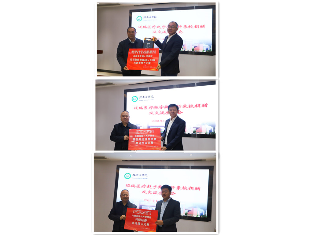 迈瑞医疗集团向学校捐赠了价值30万元的10台迈瑞急救设备AED、10万元第三期迈瑞奖学金及6万元科研经费。