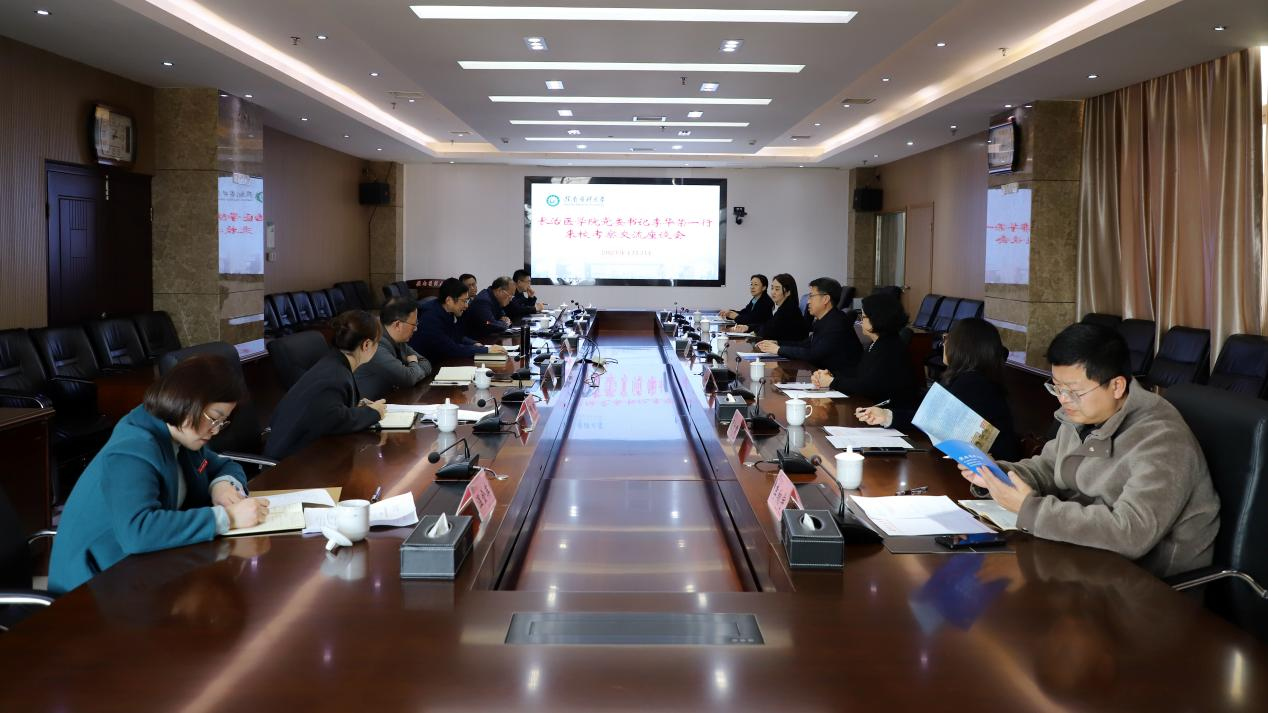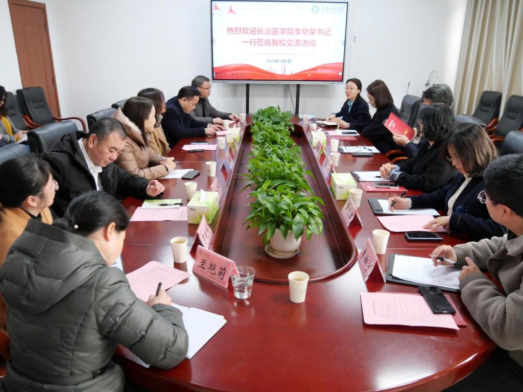 1月3日,长治医学院党委书记李华荣,长治医学院党委常委、副校长来丽娜一行来校考察交流。学校党委书记、校长张小康出席座谈会并致欢迎辞。学校党委委员、副校长叶军明主持座谈会并介绍学校建设发展情况。