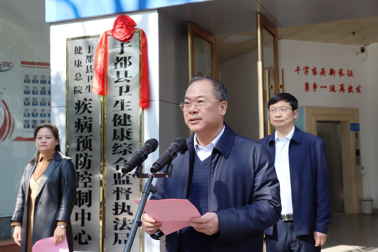 揭牌仪式上,学校党委委员、副校长叶军明代表学校党政和全体师生员工,向长期以来关心、支持我校建设发展的各级领导和社会各界表示衷心的感谢。他指出,赣南医科大学附属于都公共卫生中心挂牌成立,既是推进实施健康中国战略部署、推动新时代赣州革命老区高质量发展示范区建设的重要举措,也是双方携手并进、合作共赢的崭新起点。叶军明希望双方携手努力,明确目标定位,大力推进公共卫生中心建设;发挥各自优势,积极探索全新校地合作模式;巩固合作基础,努力实现更高水平合作共赢。