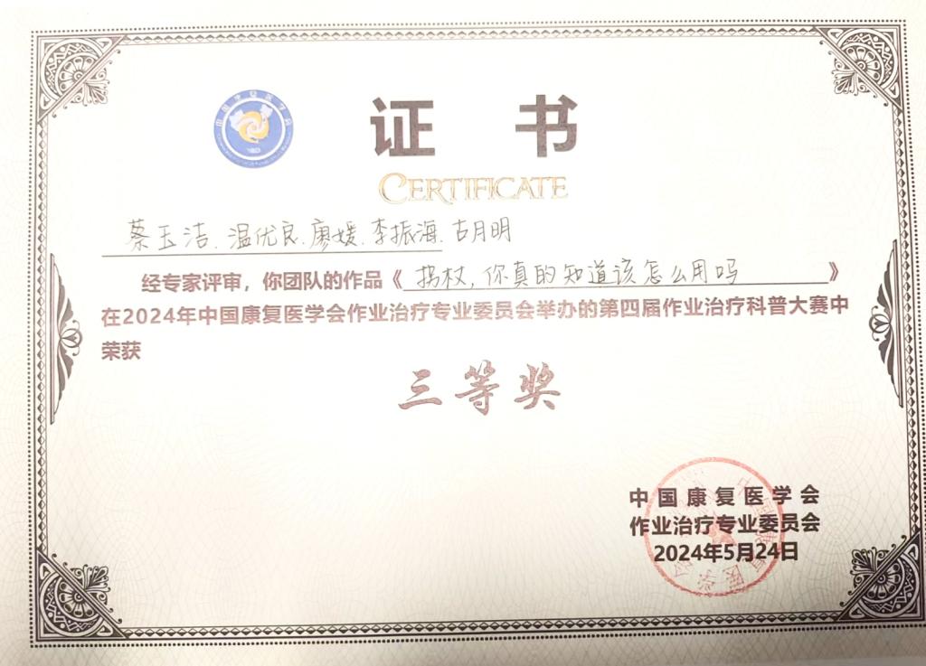 第四届作业治疗科普大赛中,康复学院院长温优良等多名教师指导,联合2022级假肢矫形工程专业本科班学生蔡玉洁共同创作的作品《拐杖,你真的知道怎么用吗》荣获三等奖。