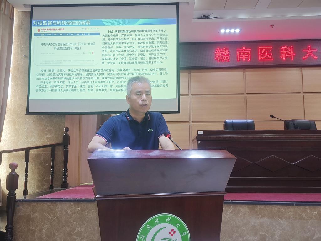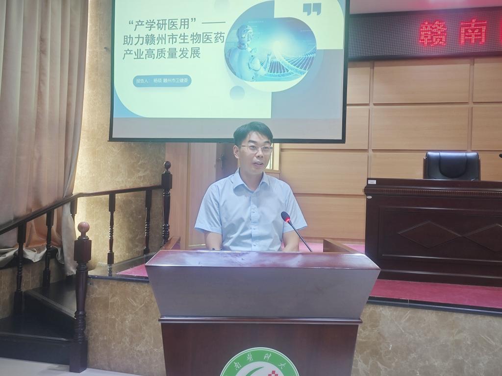 杨硕以《“产学研医用”——助力赣州市生物医药产业高质量发展》为题,从全国生物医药行业发展概况、我市生物医药产业发展优势、产业链链长机制取得成效、产学研医用一体化发展的思考和未来展望等五个方面,给大家带来了一场精彩的专题报告。杨硕提到,生物医药产业当前面临重大发展机遇,我校具有发展生物医药产业的巨大优势,要进一步加强产学研合作,推动科研成果转化,优化人才培养机制,培养生物医药人才,更好服务社会经济发展。