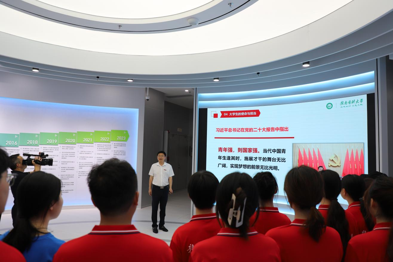 参加完相关活动后,张小康以《牢记嘱托、挺膺担当,努力成长为堪当民族复兴重任的时代新人》为题,在现场开展思政课教学。他深情回顾了学校八十余年办学历程,系统总结了近年来学校建设发展成效,并与师生代表一同展望学校未来发展的美好前景。