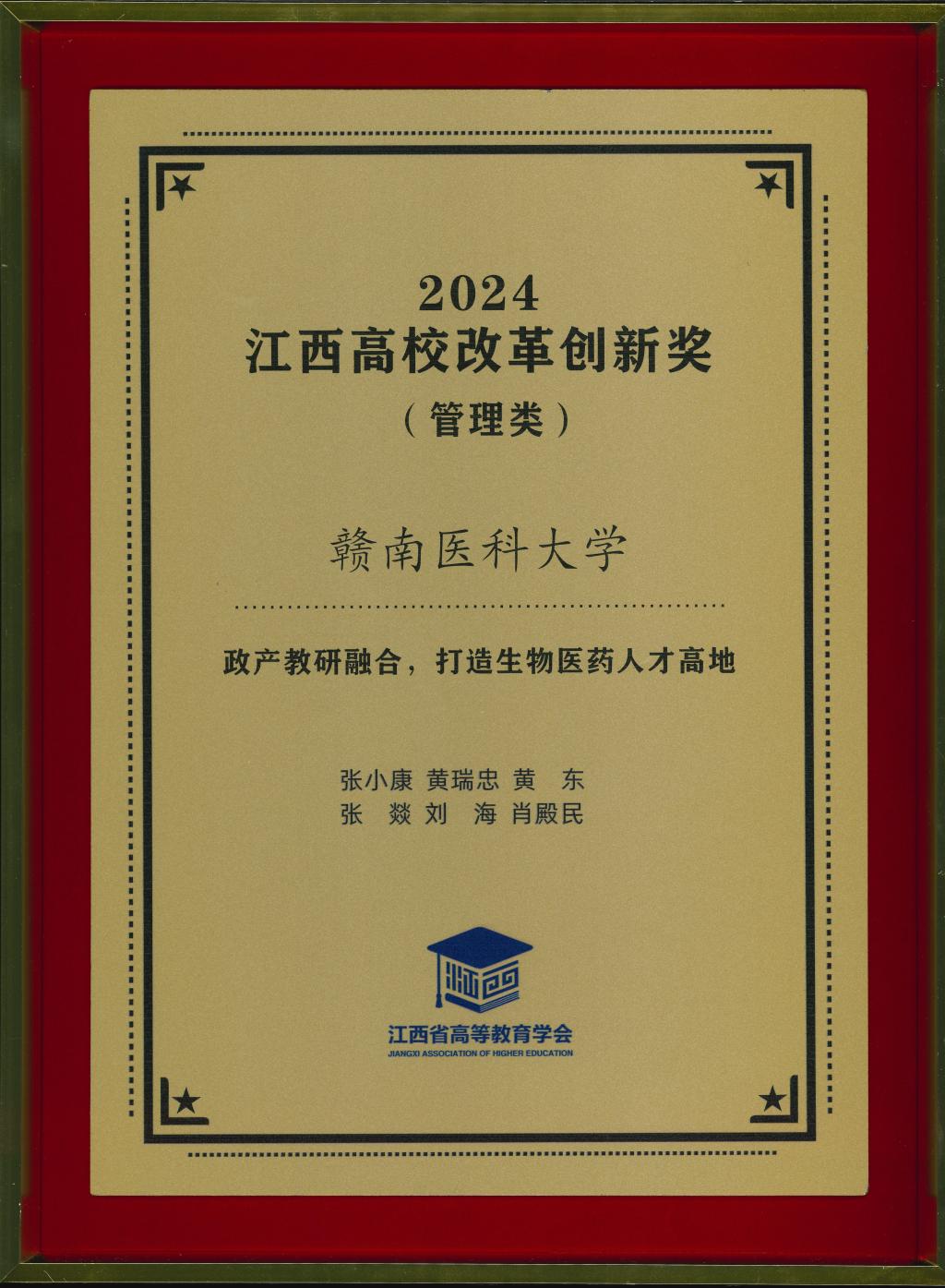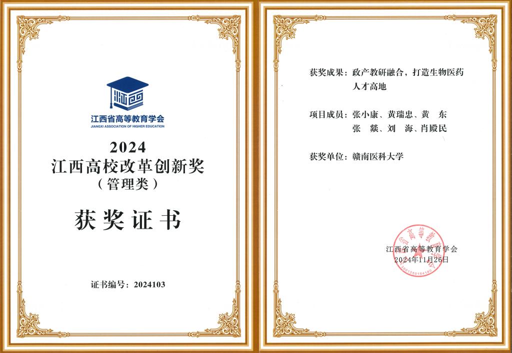 近日,在江西省高等教育学会主办的2024年高校改革创新奖评选中,我校《政产教研融合,打造生物医药人才高地》(项目成员:张小康、黄瑞忠、黄东、张燚、刘海、肖殿民)荣获2024年江西高校改革创新奖(管理类)。该项目通过深入探索和实践,充分反映了我校在办学治校、管理改革等方面取得的改革创新与成果。