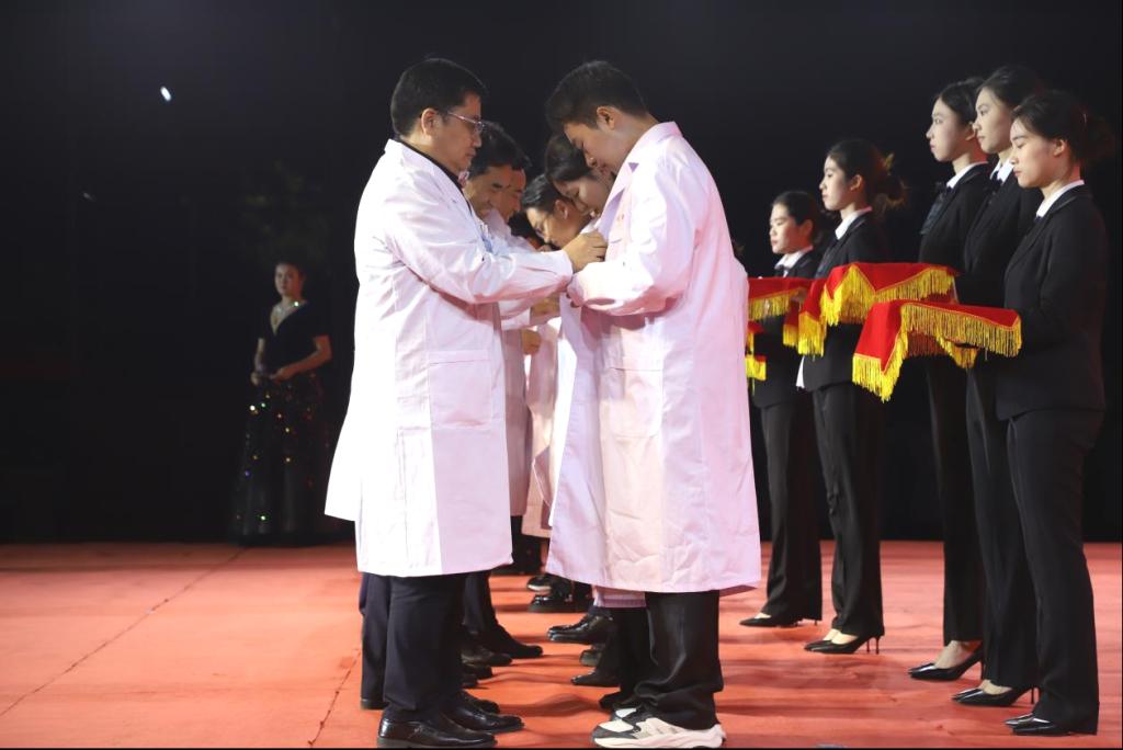 在第三环节“医路启航礼”中,医院(学院)领导、老师亲自将整洁、神圣的白袍授予三批2024级新生代表,并为他们穿上白袍、整理衣扣、佩戴听诊器、送上嘱托。台下,全体新生在庄重和严肃的气氛中,一起郑重地穿上白袍、整理好衣扣。一身白衣,象征着他们正式步入医学殿堂,承担起医者的神圣职责。