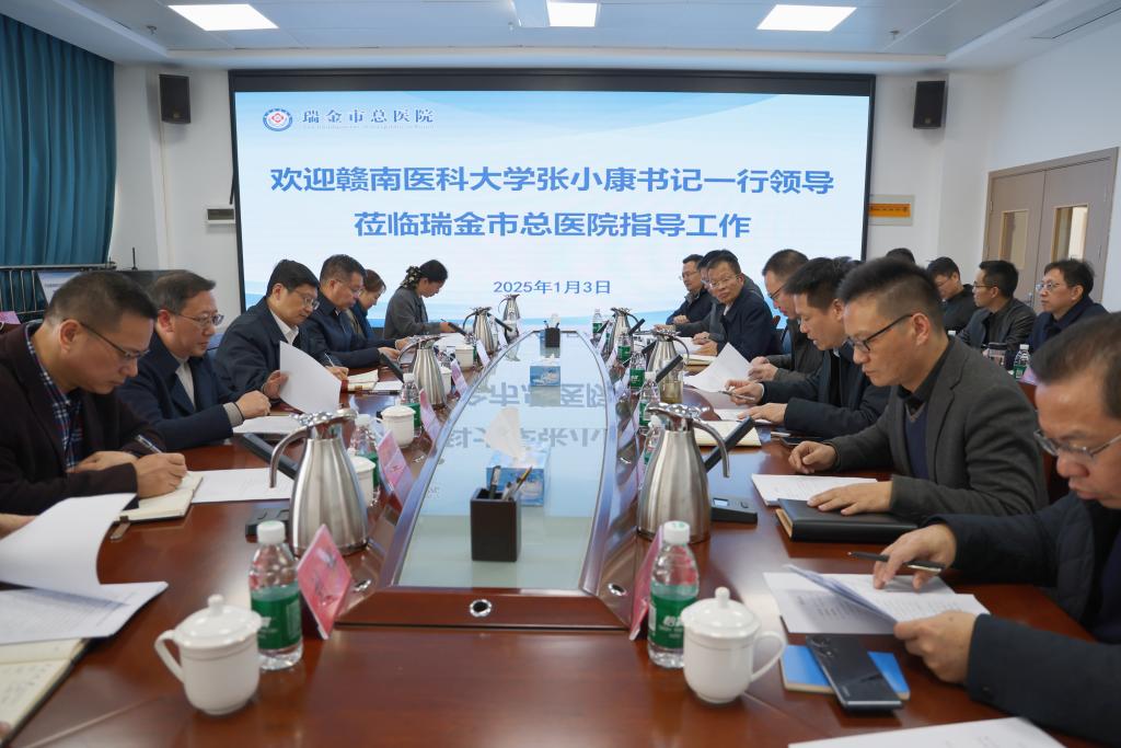 1月3日上午,学校党委书记、校长张小康,党委委员、副校长,第一附属医院(第一临床医学院)党委书记廖伟一行赴瑞金市总医院考察调研,并召开座谈会,商讨对瑞金市总医院帮扶事宜。会议由瑞金市政协副主席、总医院院长杨利勇主持,总医院全体班子成员及各办各中心负责人,三所院区主要负责人及相关业务科室负责人参加会议。