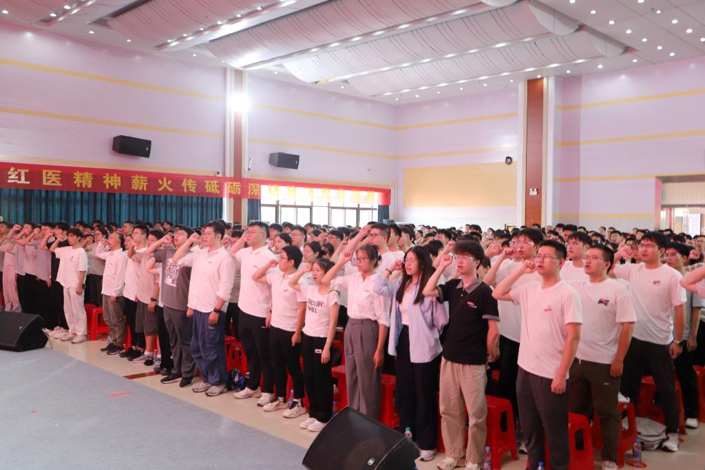 开学典礼上,在主席台就座的领导为新生代表授予了校徽,研究生导师代表、新生代表作了发言,全体人员重温了医学生誓言。