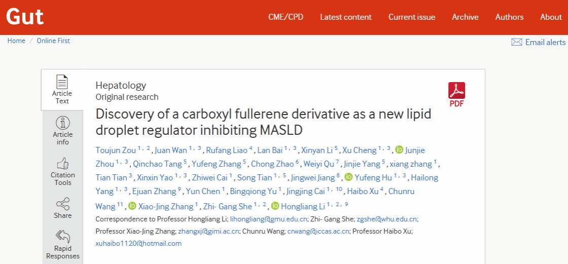 11月28日,赣南医科大学李红良教授团队在国际胃肠肝病学领域顶级期刊《Gut》(影响因子26.2)在线发表了题为《Discovery of a carboxyl fullerene derivative as a new lipid droplet regulator inhibiting MASLD》的重要研究成果。