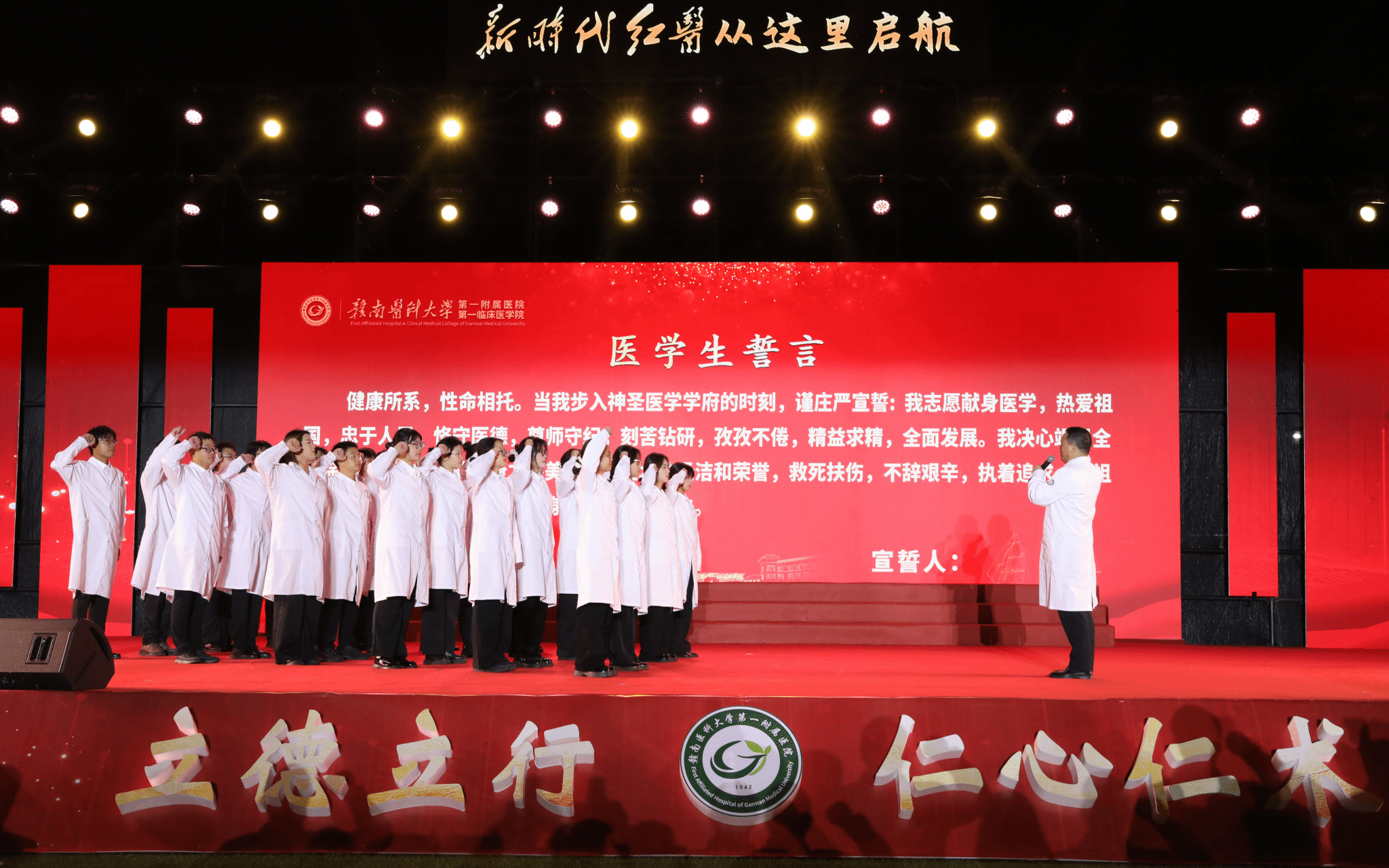 “医路启航礼”上,院领导及教师代表为新生代表授白袍、传使命,寄寓殷切期许。