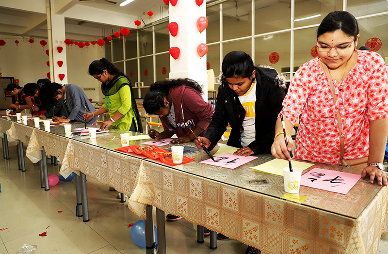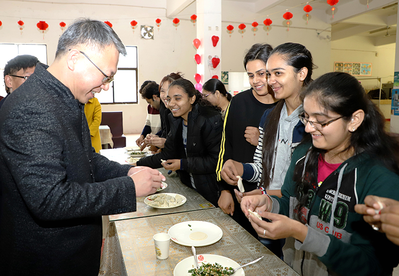 学校副校长刘民、叶军明及有关部门负责人,与全体外籍教师、留学生一起,共同欢度2019年新春佳节。师生们包饺子、写福字,感受浓郁的中国传统文化和喜庆的春节氛围。