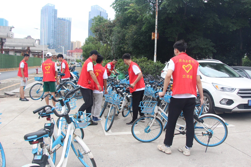 学生志愿者将道路两边的电动车、自行车摆放整齐,对占道经营的商贩进行文明劝导。