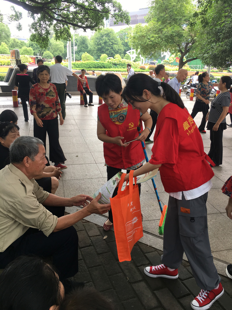 在西园,学生志愿者向纳凉休息的人们和过往的行人派发创卫宣传单,倡导以健康文明的生活行为为赣州市创建全国卫生城市贡献一份力量。