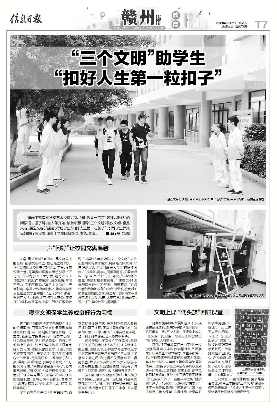 5月31日,信息日报以《“三个文明”助学生“扣好人生第一粒扣子”》为题,图文并茂形式,整版报道我校“三个文明”建设,引导学生健康成长成才,受社会广泛关注。全文如下: