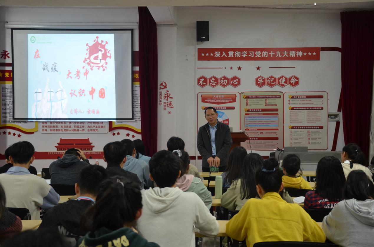 10月21日晚,学校党委委员、副校长黄瑞忠在黄金校区为联系班级2018级公共事业管理本科(2)班学生上了一堂以“在战‘疫’大考中认识中国”为题的抗“疫”思政课。