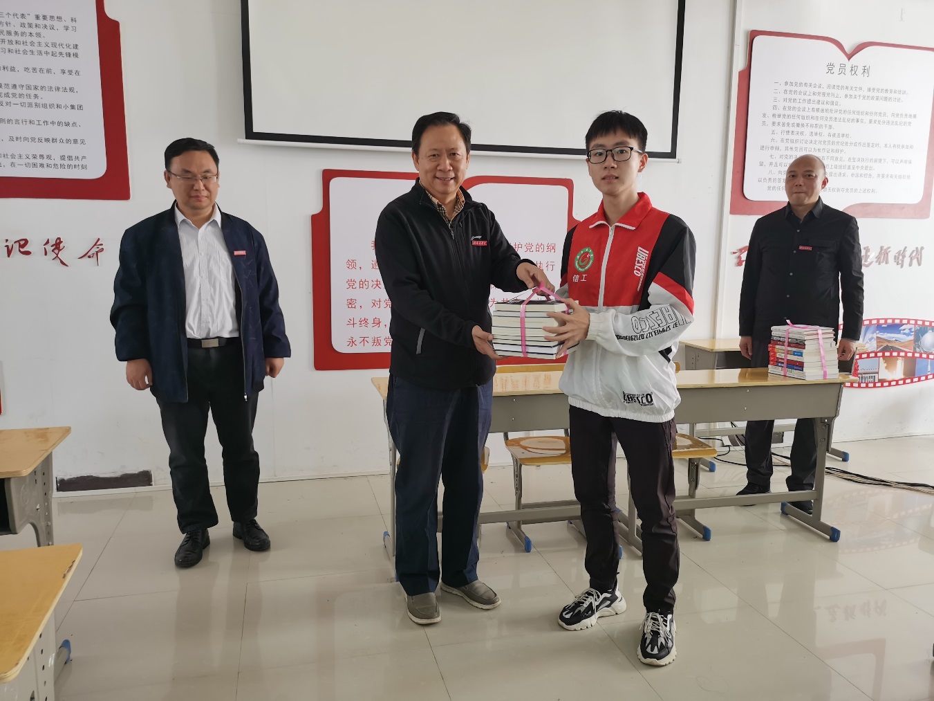 课前,陈亮为党建工作联系点学生党支部党员赠书。
