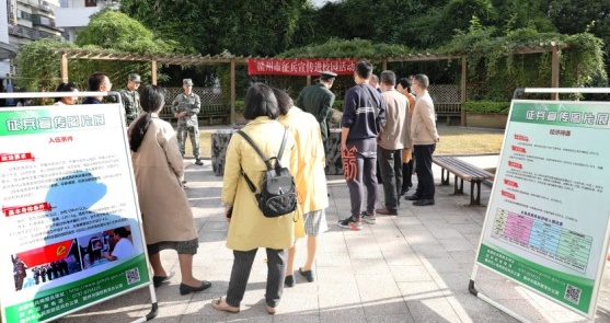 此次宣传活动恰逢我校2021届毕业生双选会,市、区征兵办在校园悬挂醒目的征兵宣传标语,设立征兵咨询站,发放征兵宣传单,吸引了众多同学和家长前来咨询,征兵办同志现场向介绍大学生征兵政策和优惠措施,提高了大学生国防观念和投笔从戎、献身国防的参军热情。