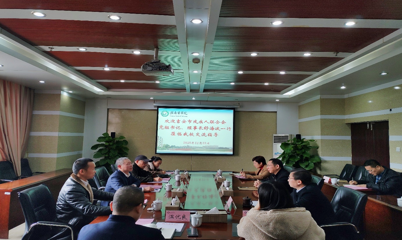 12月23日下午,吉安市残疾人联合会党组书记、理事长舒海波率吉安市残联康复科负责人肖晖、深圳市明星医疗投资管理有限公司董事长柯明开、江西福祉实业有限公司董事长李茂一行来学校交流座谈。学校党委副书记、校长刘潜会见了舒海波一行。