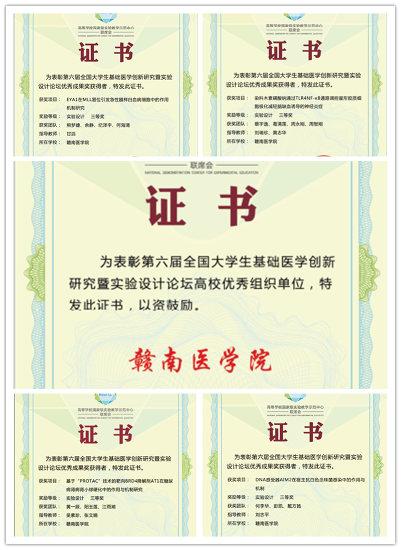 第六届全国大学生基础医学创新研究暨实验设计论坛已结束。经过激烈的角逐,由刘志平、甘滔、黄志华、刘瑞珍、吴素珍、张文娟老师分别指导的何李华、黄一辰、熊梦婕、蔡宇逸同学分别代表4支参赛团队进入决赛汇报,最终获得三等奖四项,赣南医学院获得高校最佳组织奖。我校在该项赛事成绩取得了新的突破。