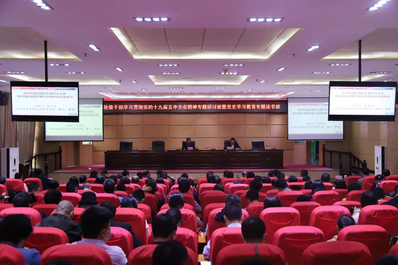 4月12日下午,2021年全校处级领导干部党的十九届五中全会精神专题研讨班暨党史学习教育专题读书班继续进行,省委党校经济学部主任、博士、教授吴志远作题为《加快构建以国内大循环为主体、国内国际双循环相互促进的新发展格局》的专题辅导报告。学校党委副书记曾泽鑫主持。