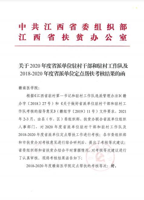 近日,从江西省委组织部、江西省扶贫办公室印发的《关于2020年度省派单位驻村干部和驻村工作队及2018-2020年度省派单位定点帮扶考核结果的函》中获悉,我校在2018-2020 年度定点帮扶单位考核中被评为“好”等次,我校驻赣州市会昌县小密乡罗田村工作队在2020年度考核中被评为“好”等次,我校2020年度驻村工作队员刘辉在考核中被评为“优秀”。