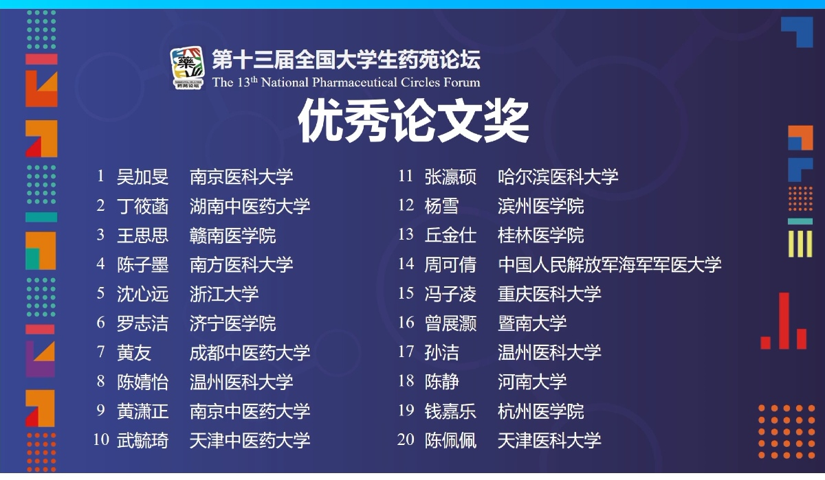全国大学生药苑论坛被誉为“药学挑战杯”,是国内药学领域高水平的学生竞赛,对激发药学生专业志趣和创新潜能,展示药学科学和药学服务领域的大学生创新创业成果和实践育人成效具有重要意义。此次论坛吸引了清华大学、北京大学、浙江大学、中山大学、中国药科大学等全国110余所高校的近600名师生,共计202项本科生成果及论文参与角逐。赛事通过“线上+线下”模式开展,经过壁报交流、论文评选、学生答辩等环节,共评选出优秀论文奖37项(我校排名第3),创新成果奖特等奖3项,一等奖21项,二等奖37项,三等奖56项。