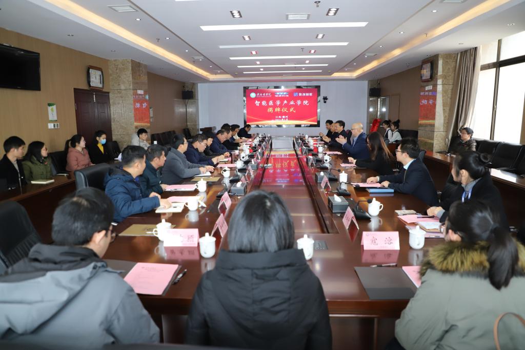 3月23日上午,赣南医学院智能医学产业学院揭牌仪式在黄金校区举行。江西憶源多媒体科技有限公司董事长徐林楠、江西数创智联科技产业发展集团有限公司董事长吴震宇,学校党委委员、副校长叶军明等出席仪式。