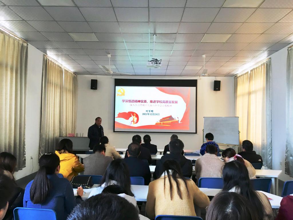 叶军明以《学深悟透精神实质,推进学校高质量发展》为题,带领大家回望百年党史,感悟四个历史时期的伟大成就,马克思主义中国化的三次飞跃,深刻领会“两个确立”的决定性意义。通过丰富的史料和生动的事例,对党的十九届六中全会精神和省第十五次党代会精神进行了系统阐释和生动解读。