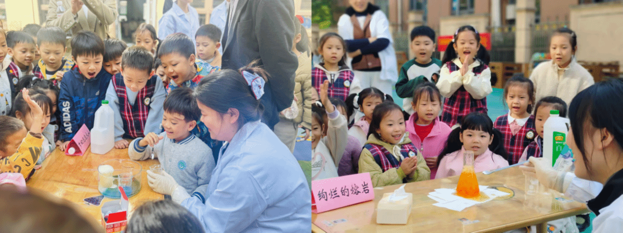 为打造趣味盎然的沉浸式科普课堂,充分激发孩子们的科学好奇心与探索欲,党支部精心设计了一系列兼具知识性与趣味性的科普实验,让“化学就在身边”的理念深植童心。活动现场,“变色魔法水”“彩虹雨”“梦幻泡泡火山”“水中跳舞的鸡蛋”“会吹气球的瓶子”“绚烂的熔岩”等趣味实验轮番上演,奇妙的科学现象瞬间点燃了小朋友们的参与热情。孩子们围坐实验桌前,眼神专注、屏息观察,现场欢呼声此起彼伏,气氛热烈。