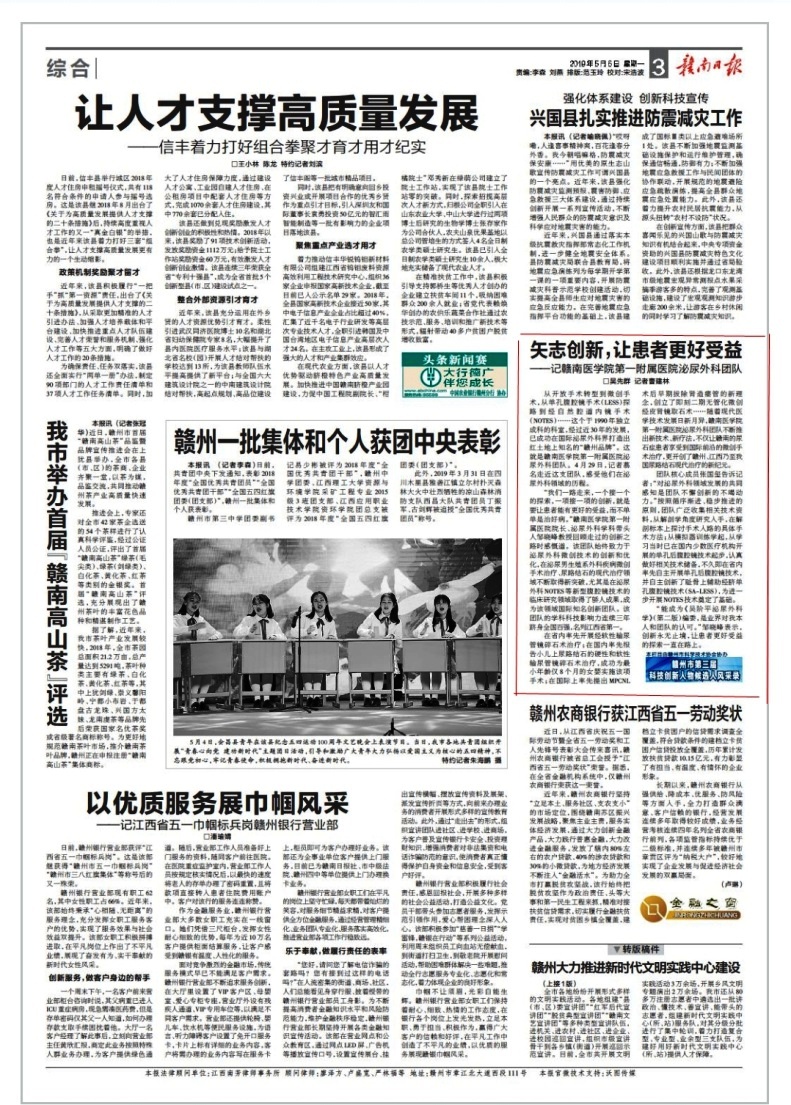 5月6日,赣南日报发表《矢志创新,让患者受益—记赣南医学院第一附院医院泌尿外科团队》一文,报道了赣医一附院泌尿外科矢志创新,让患者不断享有更好受益的发展历程。