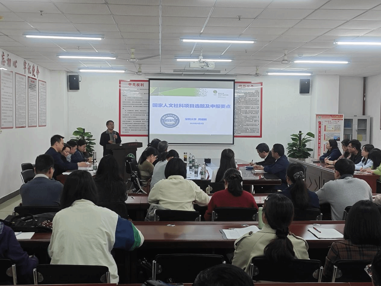 4月3日下午,深圳大学文化产业研究院院长周建新教授应邀来我校蓉江校区,开展题为《国家人文社科项目选题及申报要点》的专题学术讲座。讲座由学校党委常委、副校长刘志平主持,学校各相关学院负责人、科研骨干等60余人参加讲座。