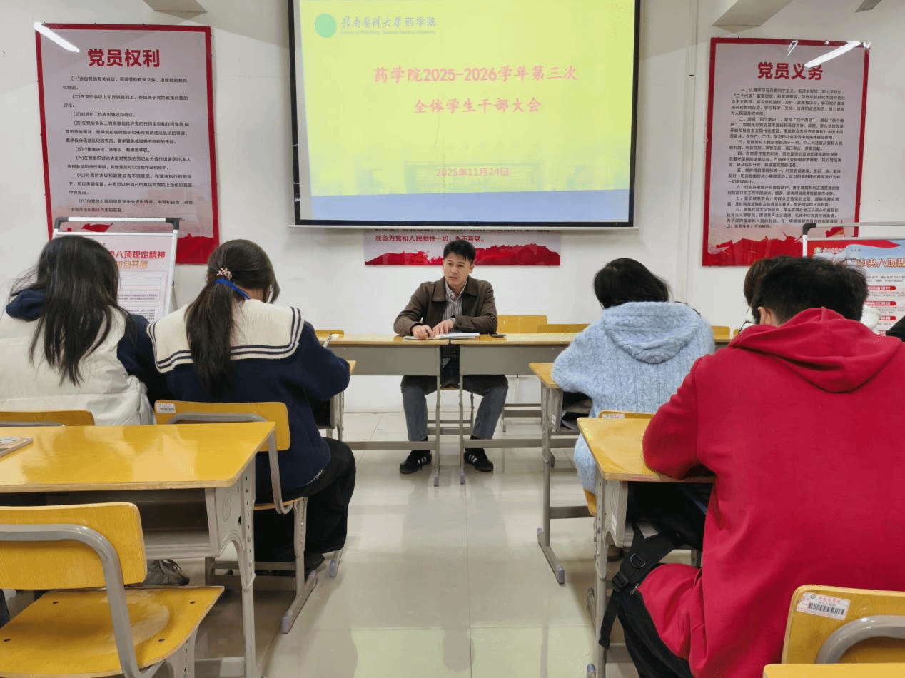 11月24日晚,药学院在蓉江校区召开2025-2026学年第三次全体学生干部大会。会议由学院团委副书记袁东波主持,学生会主席团成员及各部门负责人参加会议。