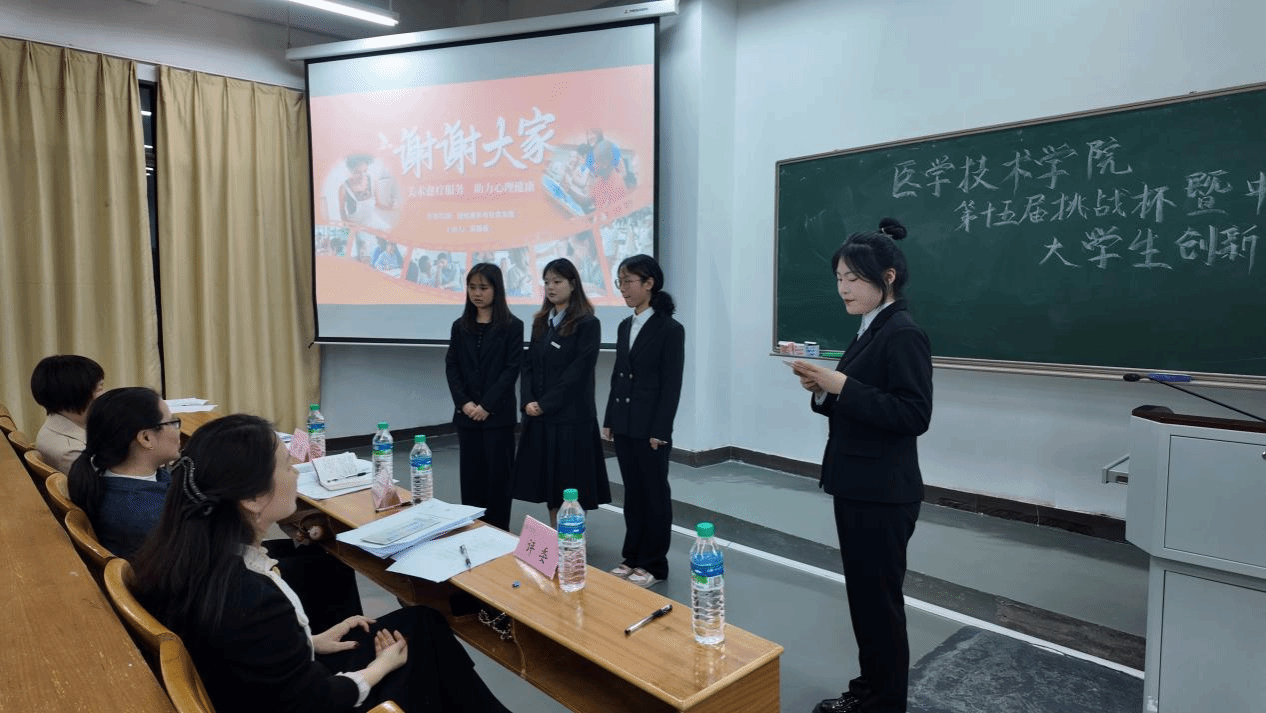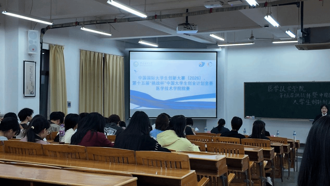 3月17日晚,医学技术学院在蓉江校区举办中国国际大学生创新大赛(2026)暨第十五届“挑战杯”中国大学生创业计划竞赛学院选拔赛。学院副院长甘滔、医学检验技术专业负责人江丽霞、医学检验技术教研室副主任朱颖担任评委,学院党委副书记鲁陈、学工办辅导员到场观赛,各参赛团队及学生代表共同参与本次赛事。