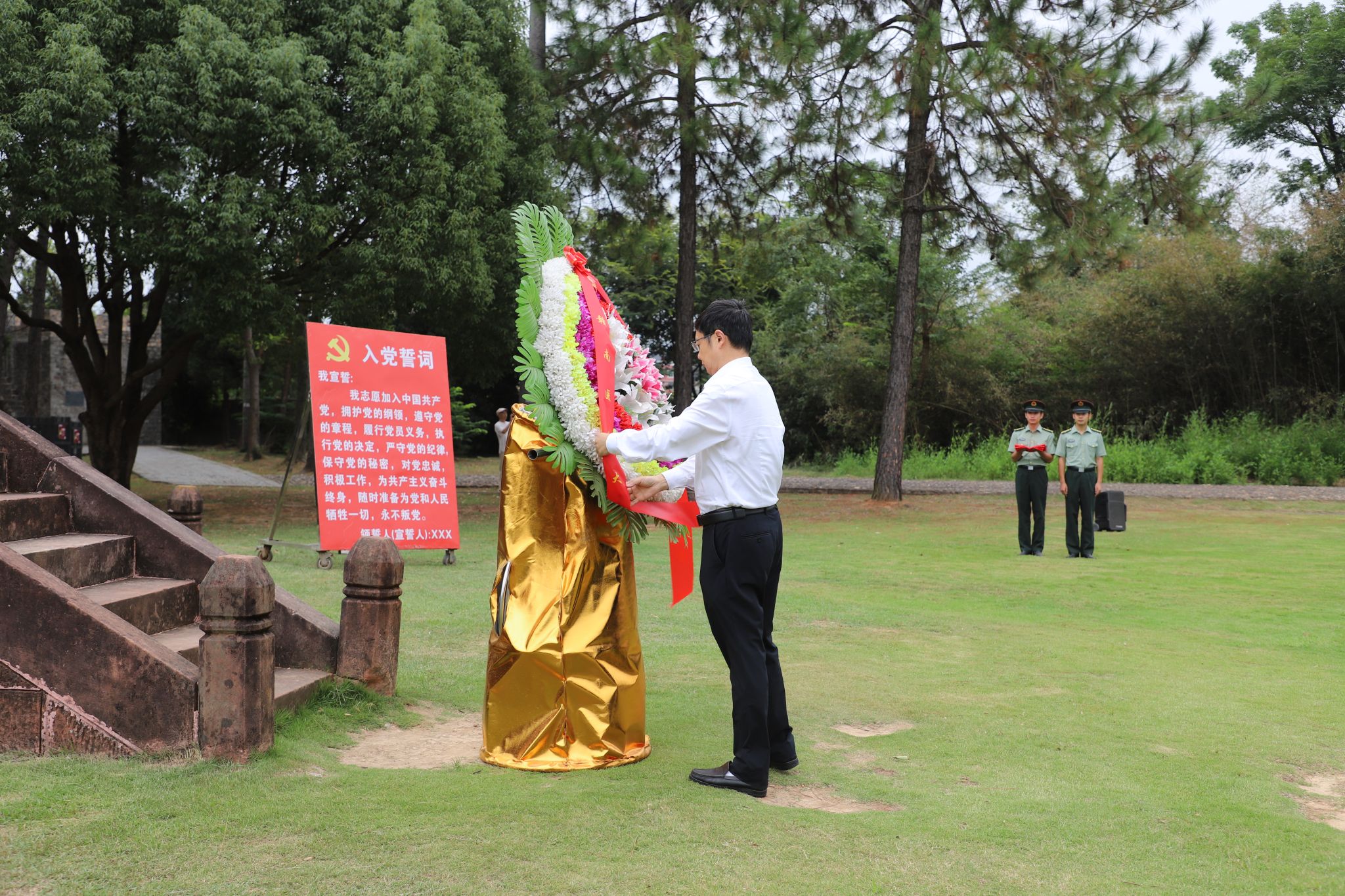 在庄严肃穆的红军烈士纪念塔前,张小康代表全体师生党员敬献花篮,整理花篮缎带。大家肃立默哀,深切缅怀为革命事业英勇献身的先烈们。面向鲜红的党旗,全体党员举起右拳,重温入党誓词,铿锵有力的誓言在广场上空回荡,表达了师生党员们不忘初心、牢记使命,为党和人民事业奋斗终身的坚定信念。