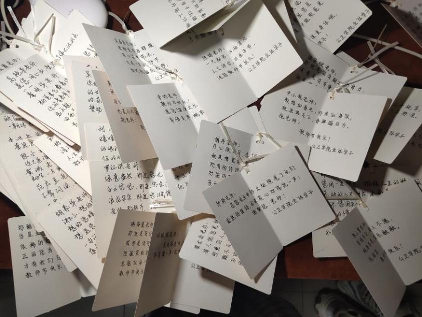 教师节前一天,该院学生给该院50名教师书写贺卡,每一张手写贺卡上都写上了同学们对老师衷心的感谢与祝福。该院学生党支部拍摄教师节齐声送祝福视频,学生会还发起了“老师,您辛苦啦”祝福墙活动,每位参与学生在小小的便利贴上写上一句最真挚的祝福,亲手贴到祝福板上,一句句满怀深情的话语,诉说着对教师的敬爱、感激之情。