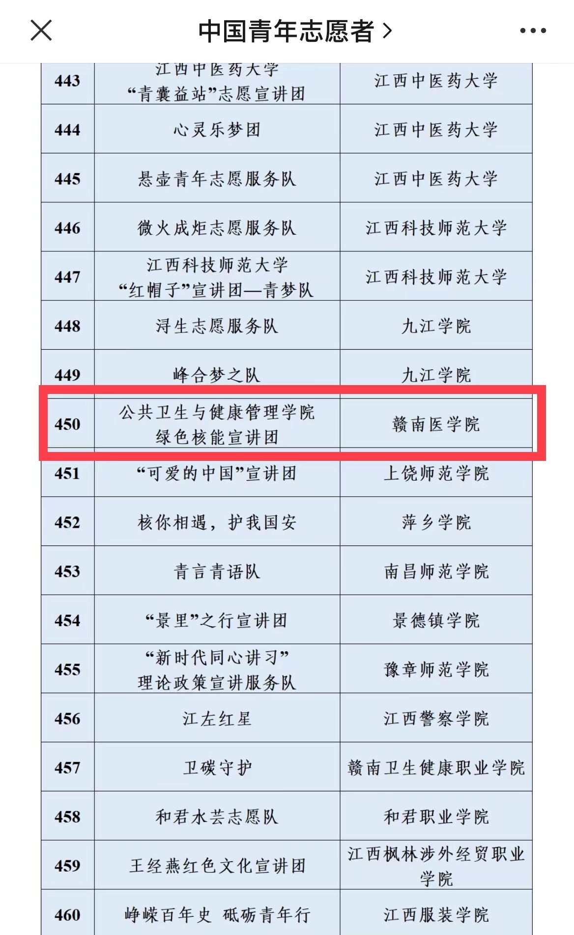 近日,团中央青年志愿者行动指导中心、中国核工业集团有限公司、中国青年志愿者协会秘书处联合开展“强国有我‘核’你一起”大学生志愿宣讲活动,在全国667所高校的1796支团队中,遴选了1000支大学生志愿服务团队,我校公共卫生与健康管理学院绿色核能宣讲团成功入选。