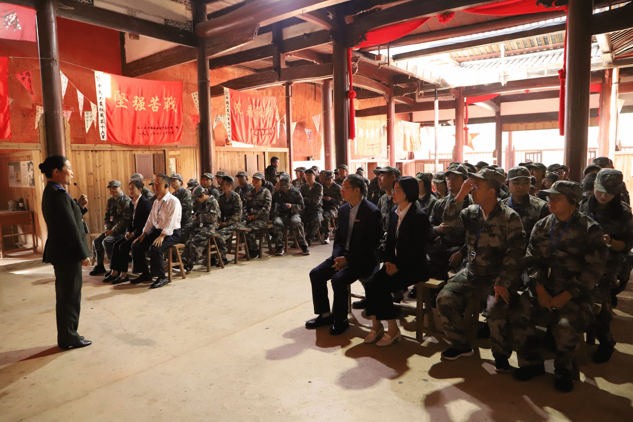 培训最后一站来到被誉为“长征第一山”的云石山,一场沉浸式的“续走新时代长征路”体验教学正式开启。学员们身着迷彩服,肩扛药箱,手中紧握大刀、长矛与木质步枪,分组开展“红军大练兵”与“编制红军草鞋”体验教学,在长枪队、大刀队的训练中锤炼意志,在一针一线的编织中感悟红军长征的艰辛。随后在飘扬的鲜红军旗引领下,沿着当年领袖与红军将士走过的山间小径稳步前行,行至马道口中央政治局旧址时,模拟长征出发前动员大会,重温红军长征的壮志豪情。