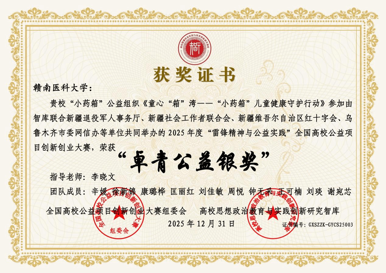 近日,在刚刚落幕的 “雷锋精神与公益实践”全国高校公益项目创新创业大赛中,我校“小药箱”公益团队凭借其创新的服务模式、扎实的实践成果和积极的社会影响,从全国百余个优秀项目中脱颖而出,一举荣获 “卓青公益银奖” 与 “社会影响力优秀奖” 两项殊荣!