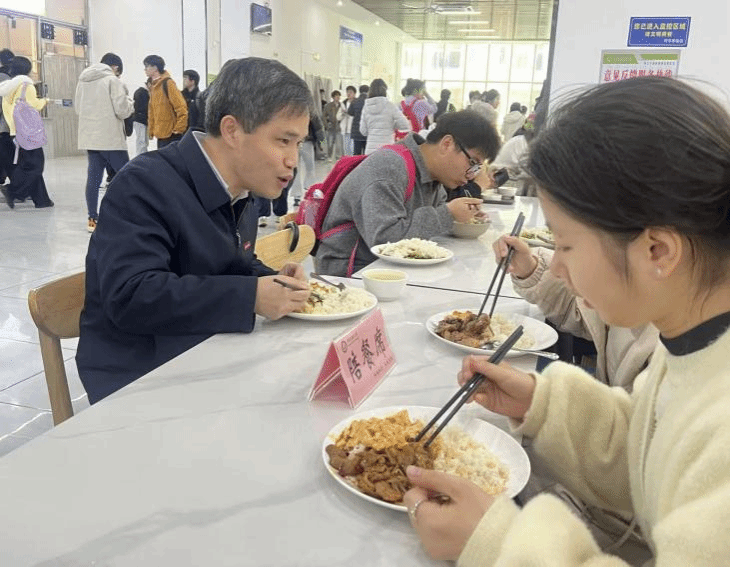 随后,刘志平走进就餐区,与返校学生一同排队取餐,与同学们围坐在一起用餐,在轻松愉悦的氛围中与大家亲切交谈。他认真倾听同学们对餐食品质、菜品搭配、口味调整、食堂服务效率等方面的意见和建议,对同学们提出的疑问耐心细致解答,切实了解学子们的就餐需求。用餐过程中,他还积极引导同学们树立节约意识,珍惜粮食、践行“光盘行动”,自觉养成文明健康、绿色节约的就餐习惯,让勤俭节约的美德在校园落地生根。
