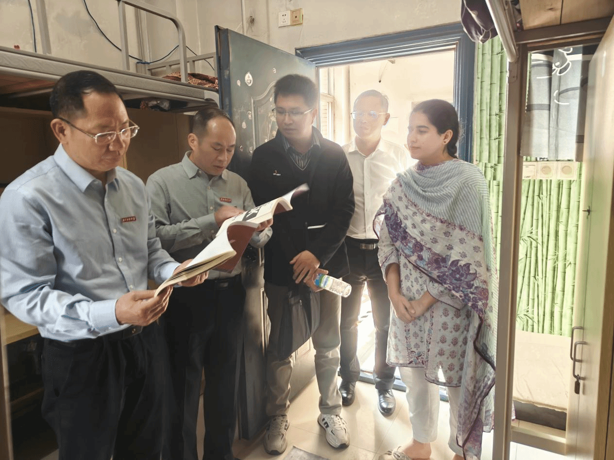 黄瑞忠一行先后走进国内学生宿舍与留学生宿舍,实地察看宿舍内务卫生、基础设施运行、消防安全设施配备等情况,详细了解同学们的住宿条件、日常学习生活需求及宿舍管理服务落实成效。走访过程中,黄瑞忠与在场学生、留学生亲切交流,细致询问大家在住宿、学习、生活等方面的实际感受与意见建议,对同学们良好的精神风貌和宿舍氛围予以肯定。他强调,宿舍安全是底线、文明是底色,全体同学要自觉遵守宿舍管理各项规章制度,增强安全防范意识,杜绝各类安全隐患;要相互尊重、包容理解,尊重不同生活习惯与文化差异,共同维护团结友爱的宿舍氛围。