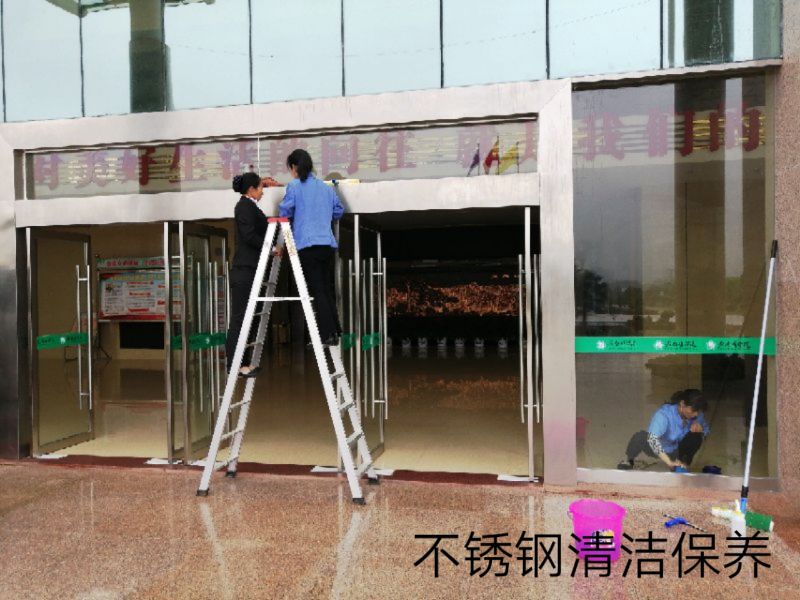 对综合办公大楼、图书馆的不锈钢大门进行清洁、保养;清理广场、道路、车位等周边杂草,处理地下车库因下水管道堵塞造成的粪便污染。