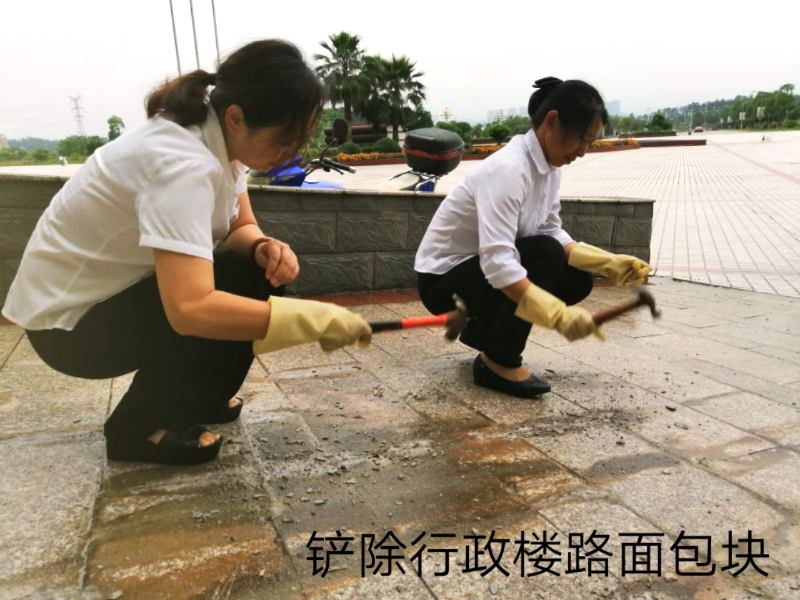 打磨平整综合办公大楼前的返硝水泥包块,铲除清理因长期下雨形成的路沿泥皮、青苔等。