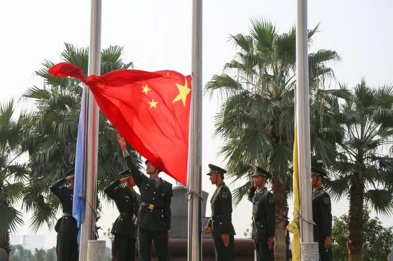 一面面鲜艳的五星红旗在黄金校区校前广场迎风飘扬,全体新生精神饱满列队站立。大学生国旗护卫队迈着有力的步伐护送国旗入场,随着雄壮的国歌响起,鲜艳的五星红旗冉冉升起,师生高唱国歌,向国旗行注目礼,向新时代伟大祖国表白,共同庆祝新中国成立70周年。